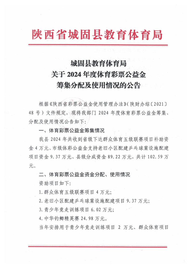 城固县教育体育局关于2024年度体育彩票公益金筹集分配及使用情况的公告
