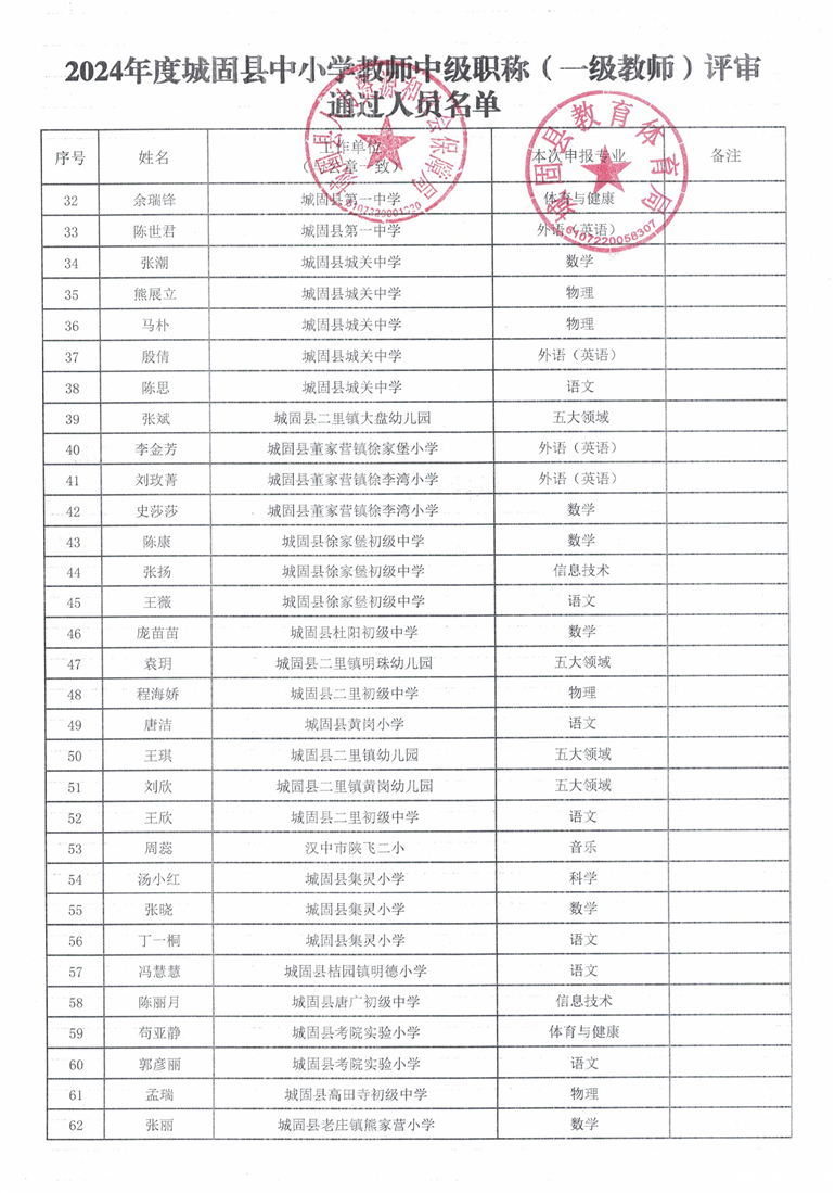 关于2024年度城固县中小学教师中级职称(一级教师)评审结果的公示