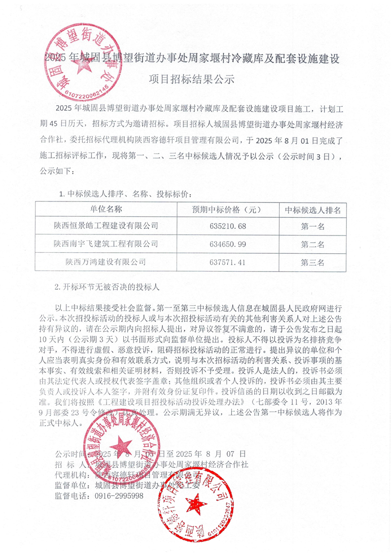 博望街道办事处周家堰村冷藏库及配套设施建设项目招标结果公示