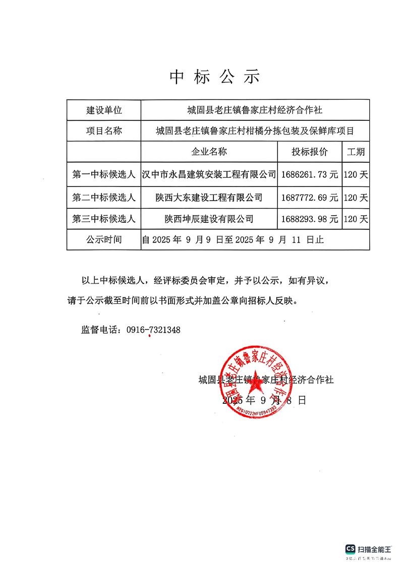 城固县老庄镇鲁家庄村柑橘分拣包装及保鲜库项目中标公示