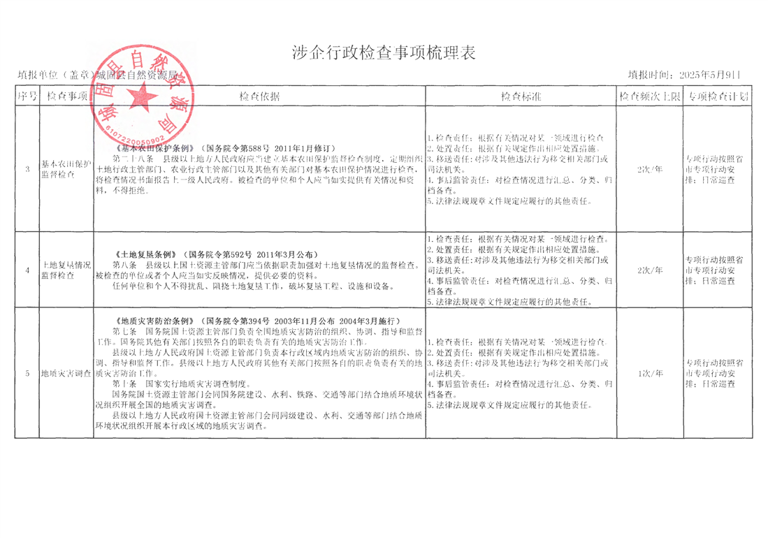 城固县自然资源局涉企行政检查事项梳理表