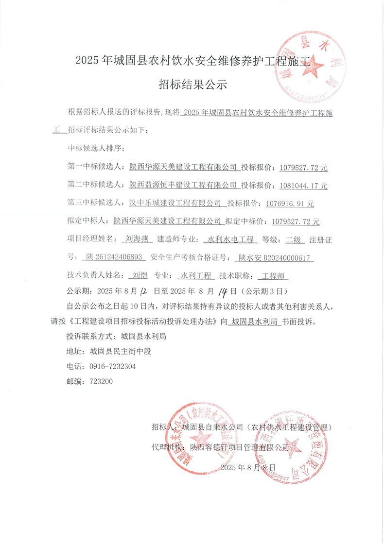 2025年城固县农村饮水安全维修养护工程施工招标结果公示